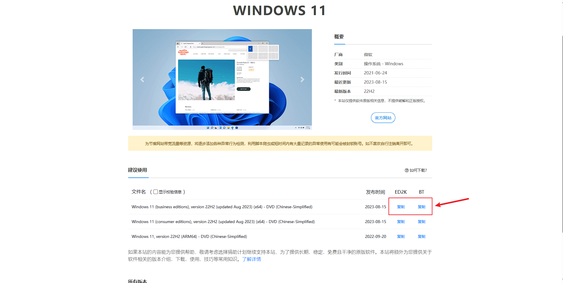 推荐选择 Windows 11 (business editions),网站提供ED2K和BT两种下载方式。使用迅雷、qBittorrent等工具或是百度网盘的离线下载功能均可进行下载。