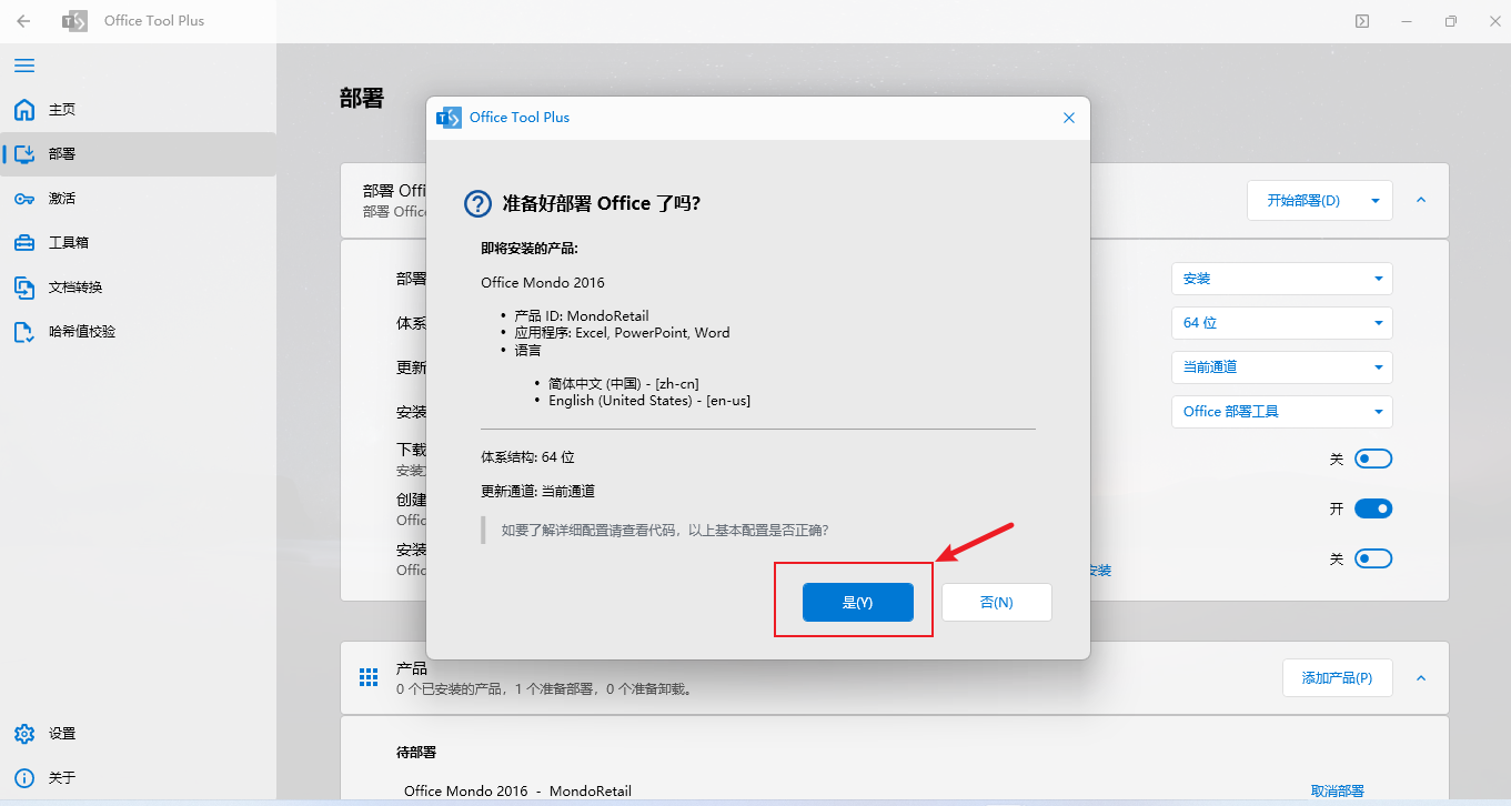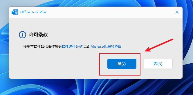 系统将再次弹窗:“你要允许应用对你的设备进行更改吗?”,点击“是”(此处无法截图,因此用文字说明代替)。 接下来是Office Tool Plus的许可条款,我们同样点击“是”。