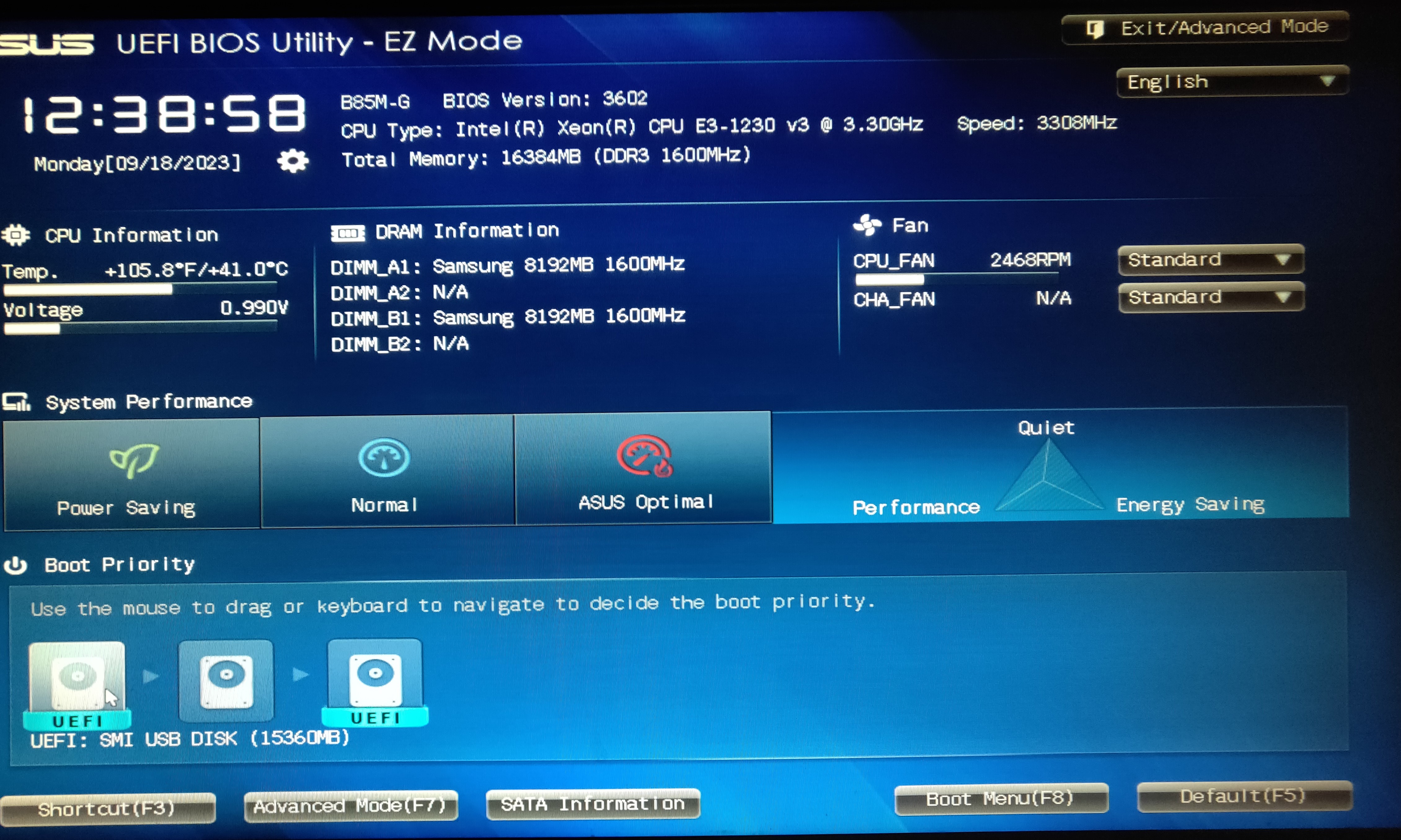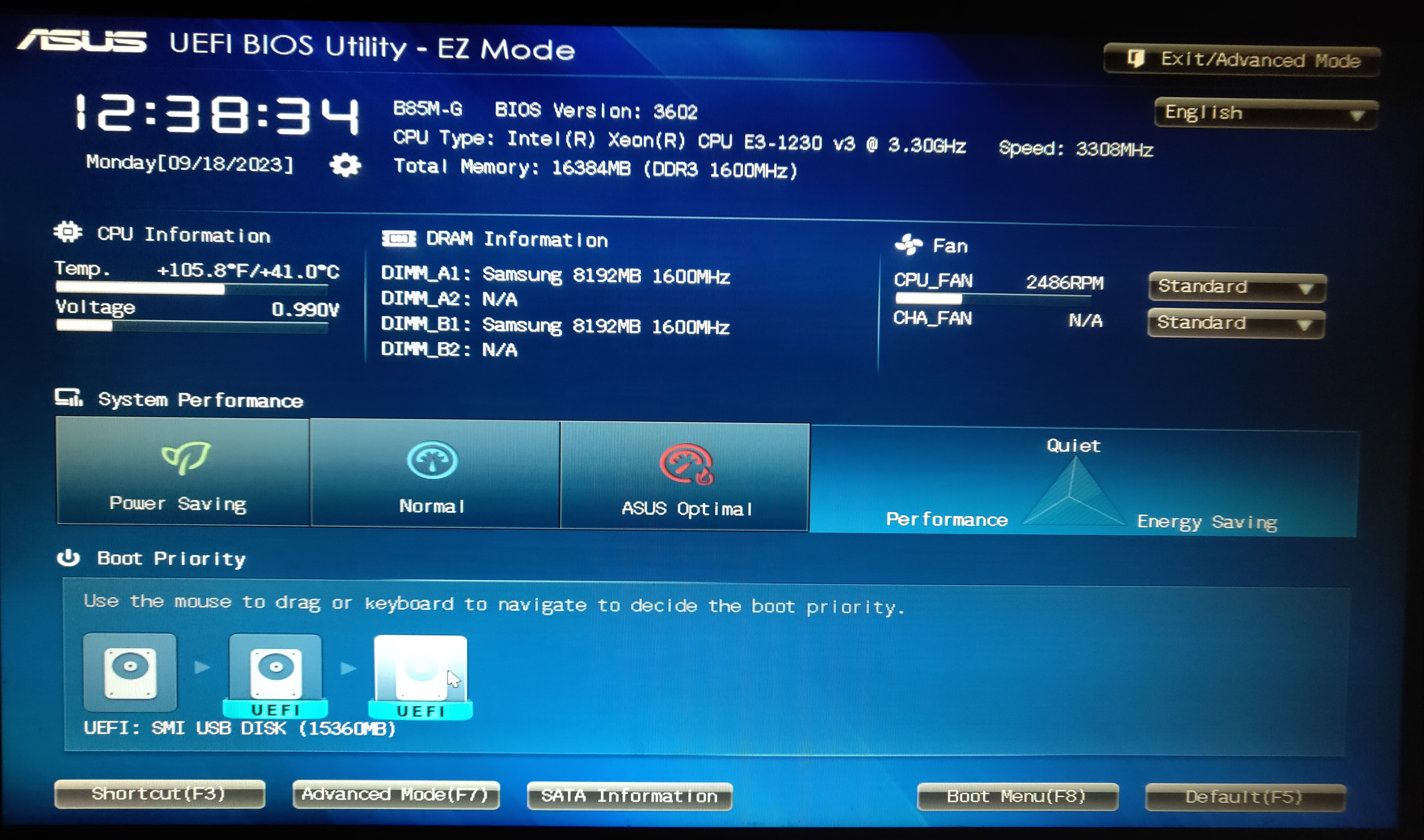 将启动U盘插入电脑USB接口(请使用主板上的接口而非机箱上的接口,即机箱后面的接口)。对多数主板来说,按下开机键,屏幕出现画面后按下键盘上的 DEL 键,即可进入Bios。该方法对于部分主板或笔记本可能并不适用,此时请在网络上搜索 主板品牌/笔记本品牌+进bios,按照提示操作即可。