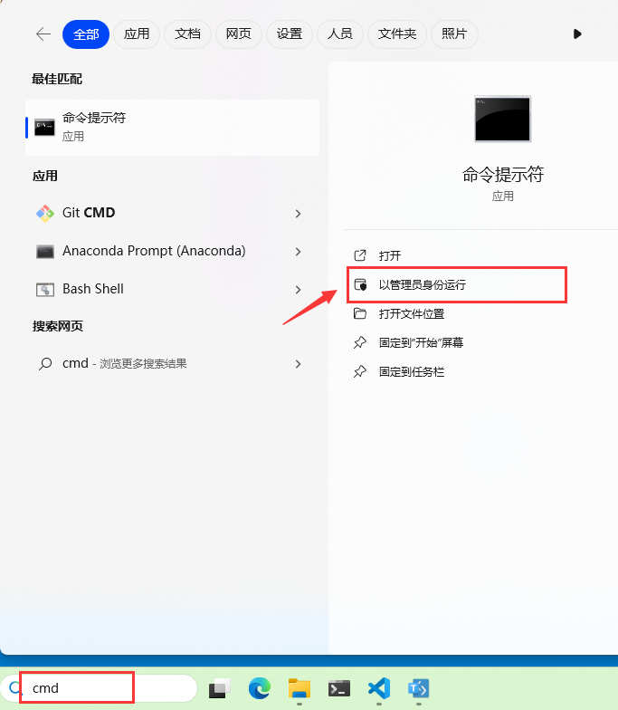 在屏幕底部任务栏的搜索框中输入“cmd”,搜索结果会出现一个名为“命令提示符”的应用。我们点击右边的“以管理员身份运行”。此时弹窗询问是否允许应用对设备进行更改,点击“是”。