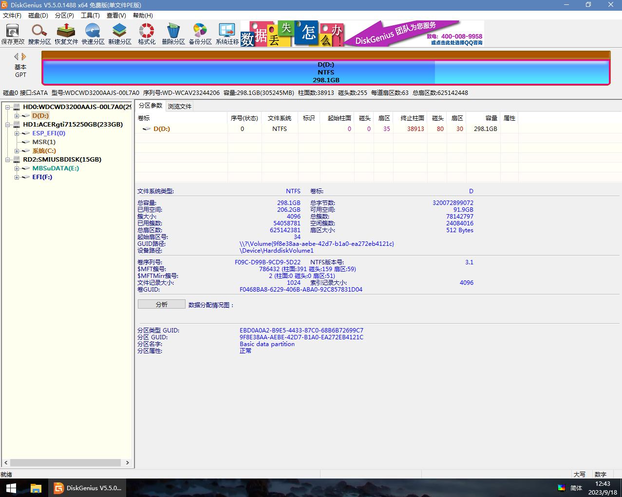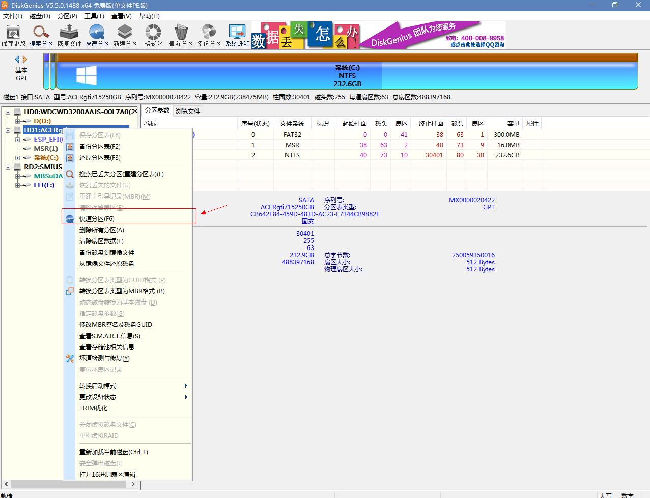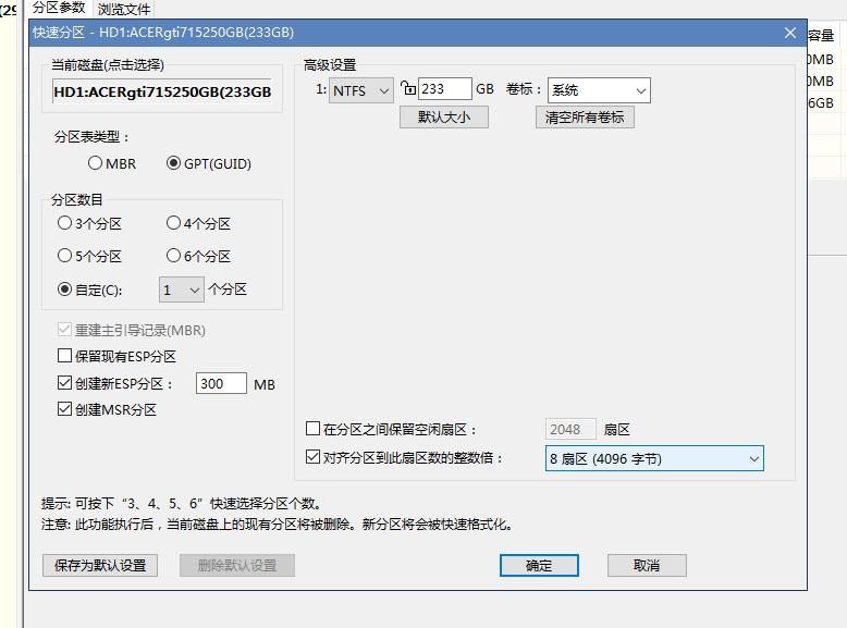 此时点击“确定”,软件将清除硬盘数据,并对其进行分区。