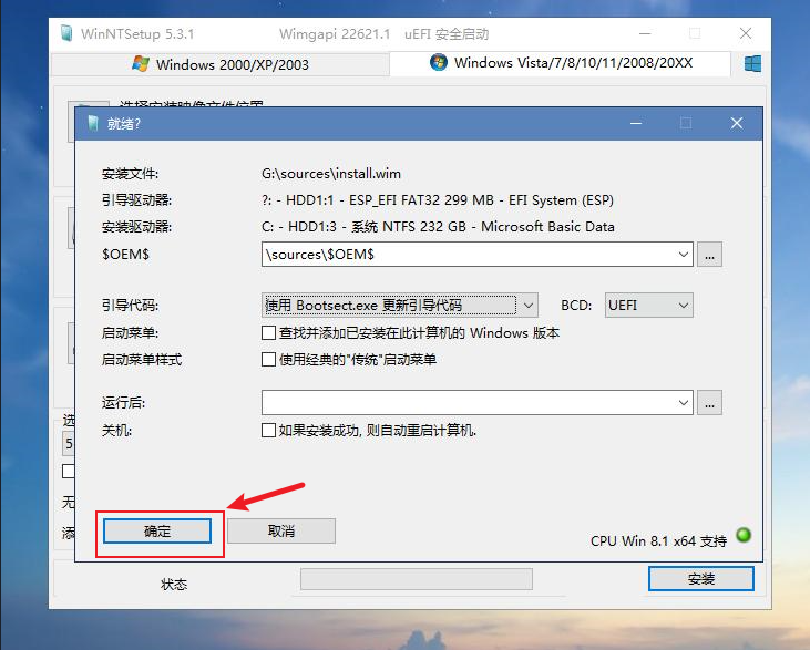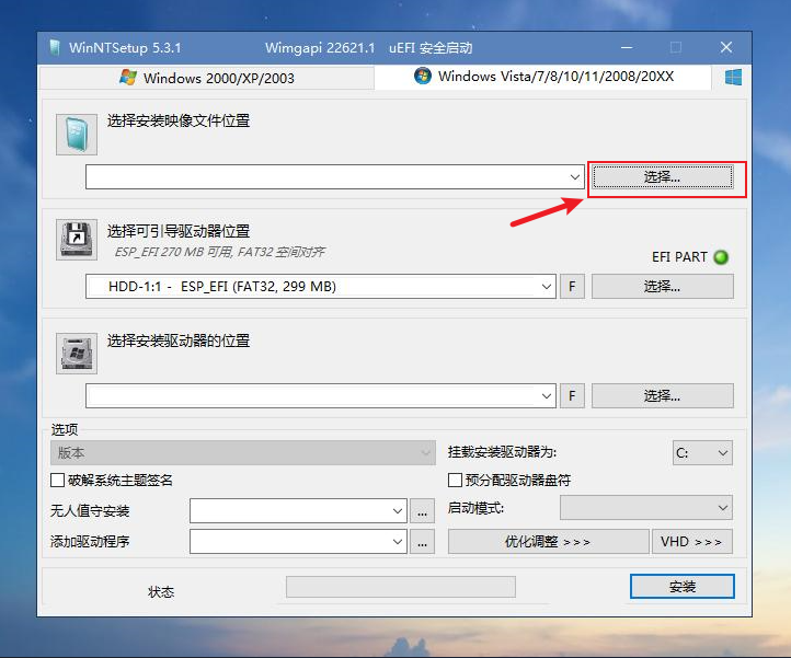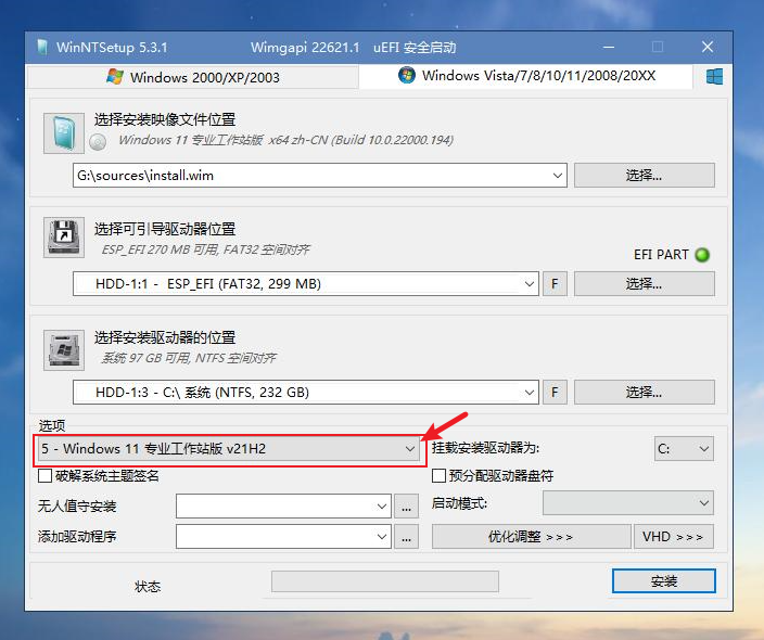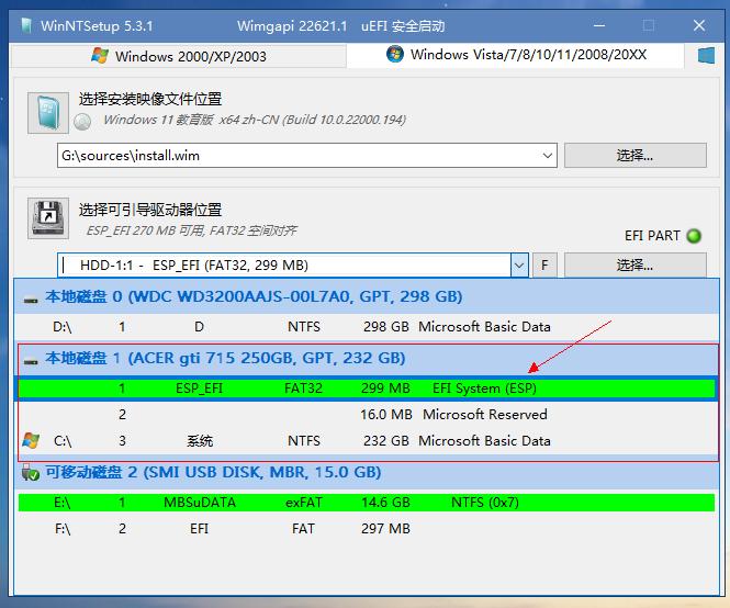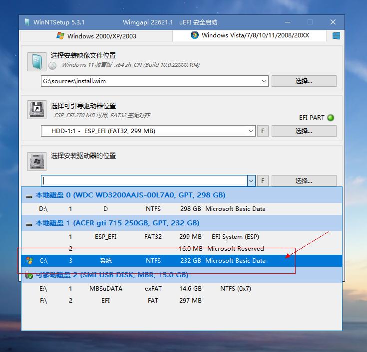 第二个选项是可引导驱动器位置。一般来说,如果上一步的硬盘分区没有问题,这里软件是能自动找到对应的引导分区的。你也可以点开再确认一遍,即要安装系统的硬盘的ESP分区,在图中是非常显眼的绿色,将其选中即可。注意不要选择启动U盘下的引导分区(带有“可移动磁盘”、“USB”等字样)。