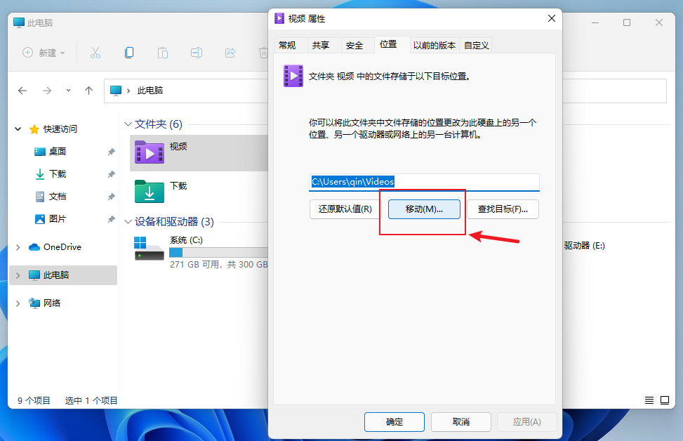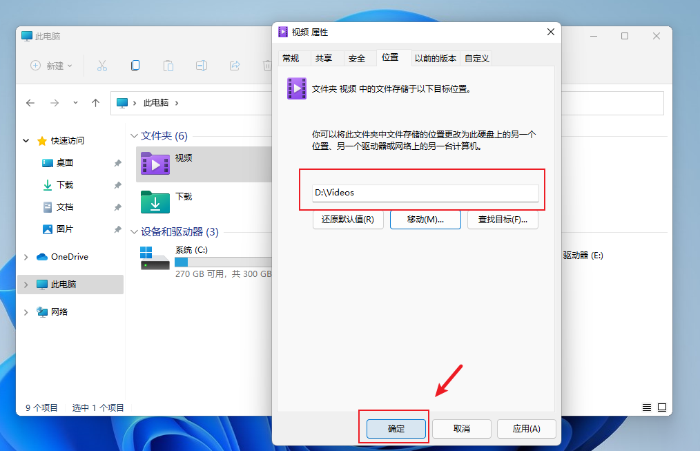 右键“视频”,依次点击“属性”-“位置”-“移动”,找到刚刚在D盘新建的“Videos”文件夹并选中,最后点击“确定”。