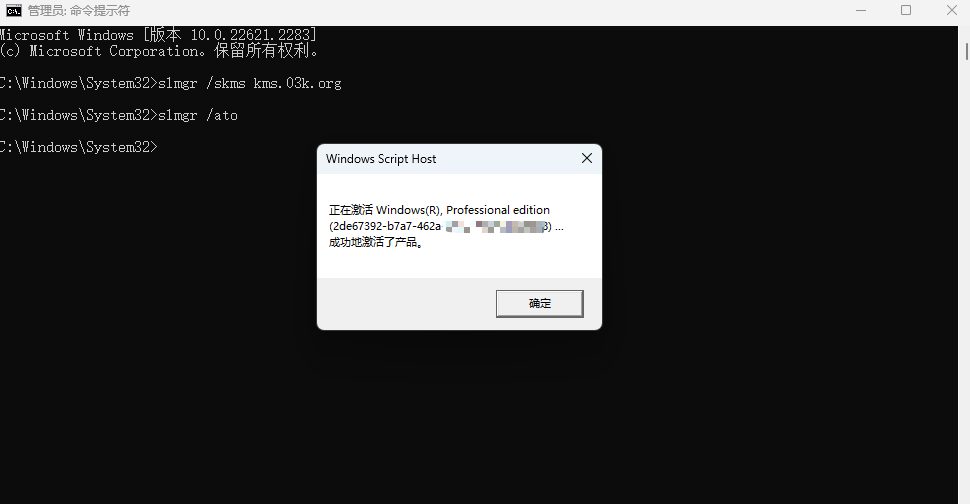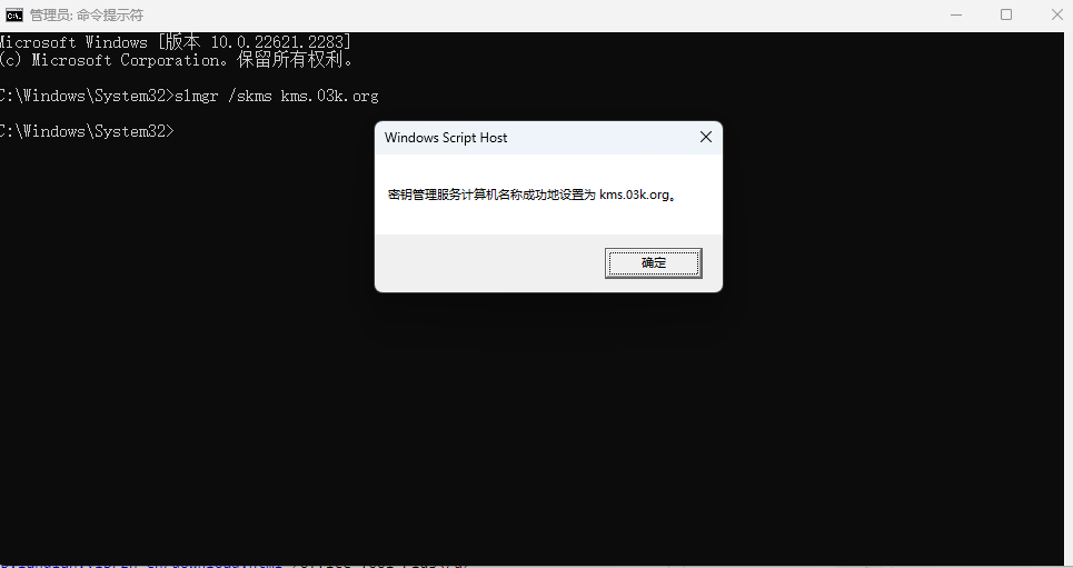系统会弹窗提示kms服务器设置成功,关闭此弹窗并在命令行中输入并回车: