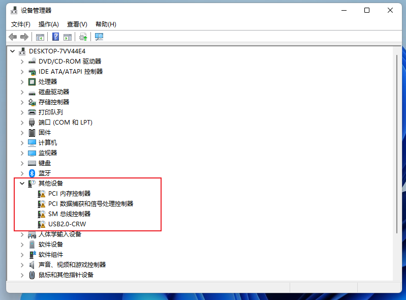 系统安装完成之初,部分硬件可能缺乏驱动程序而难以运行。如果我们打开设备管理器,则可能会看到一些带有黄色感叹号的设备。